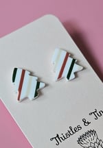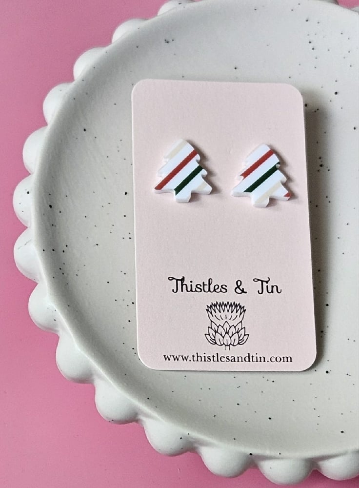 Add a touch of whimsy to your outfit with our Candy Cane Christmas Tree Studs Studs.