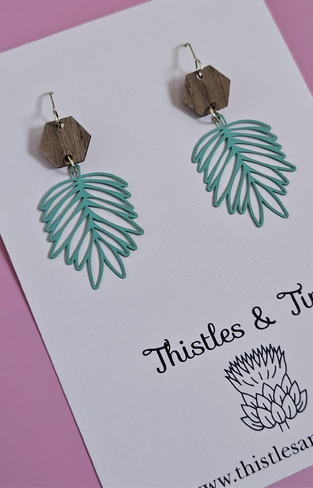 Discover our exquisite Heidi Dangles, featuring a walnut topper an intricate metal design.